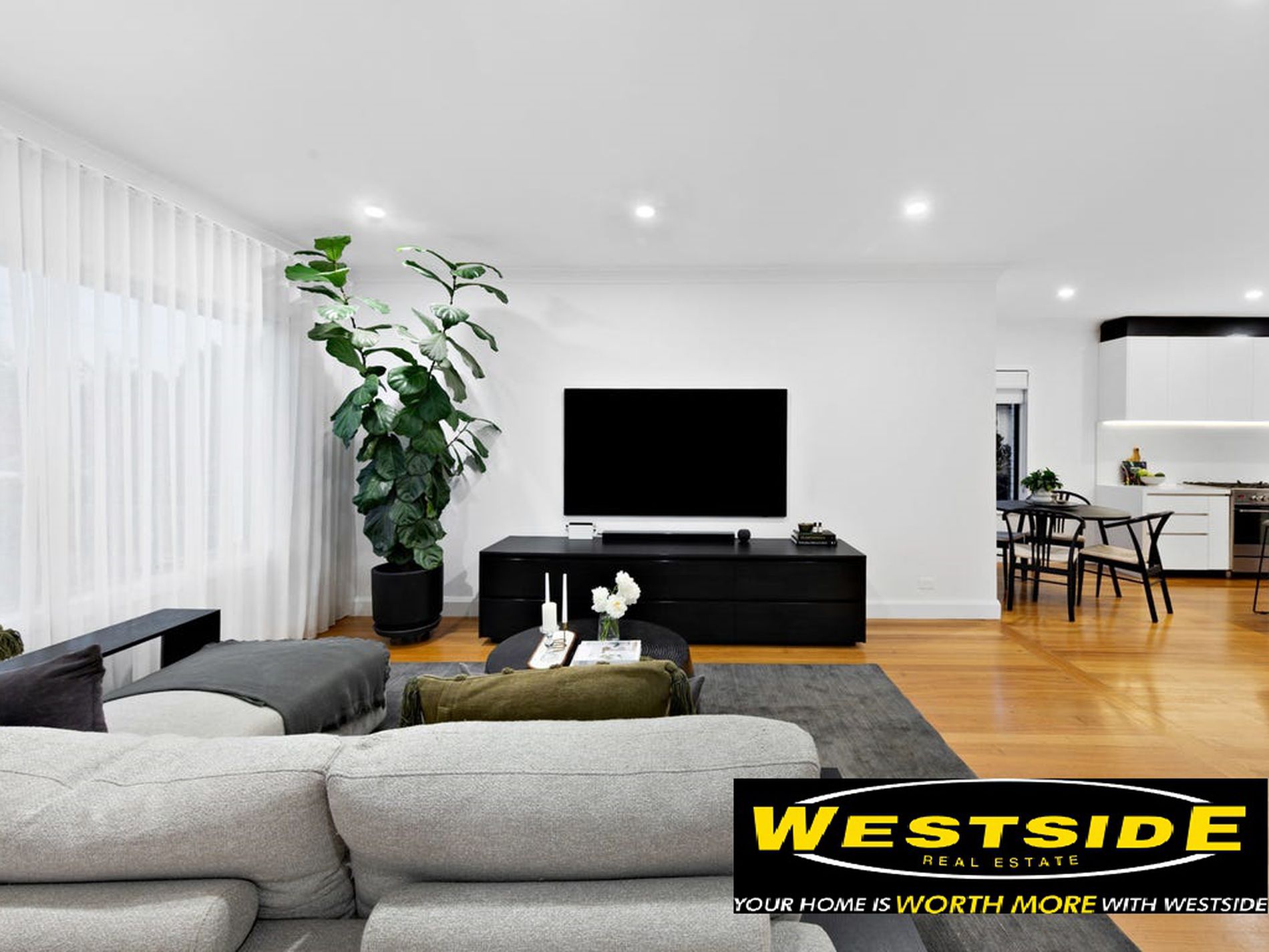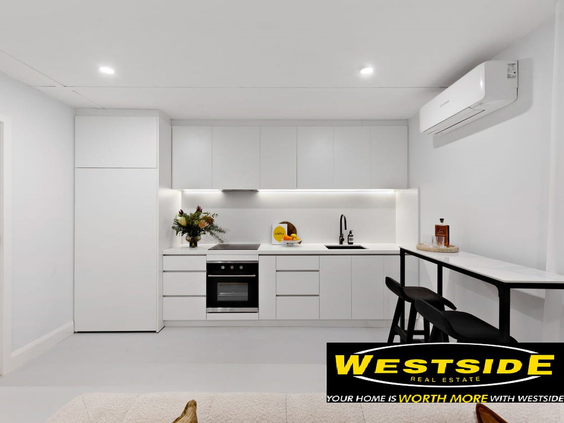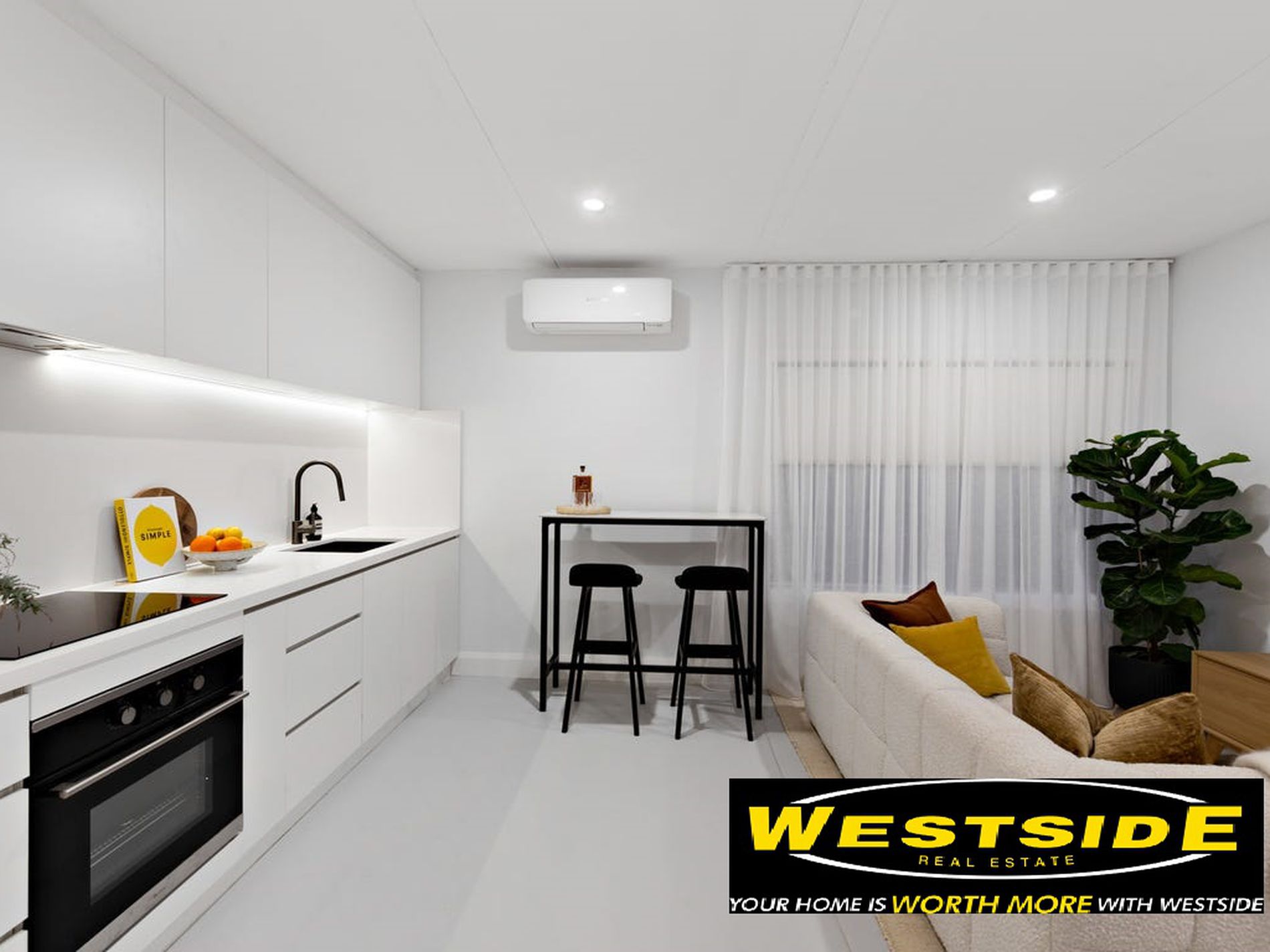 Step inside to discover a light-filled open living area flowing seamlessly into a stunning contemporary kitchen, complete with stone bench tops, LED feature lighting, and premium 900mm stainless steel appliances — perfect for everyday cooking and entertaining.