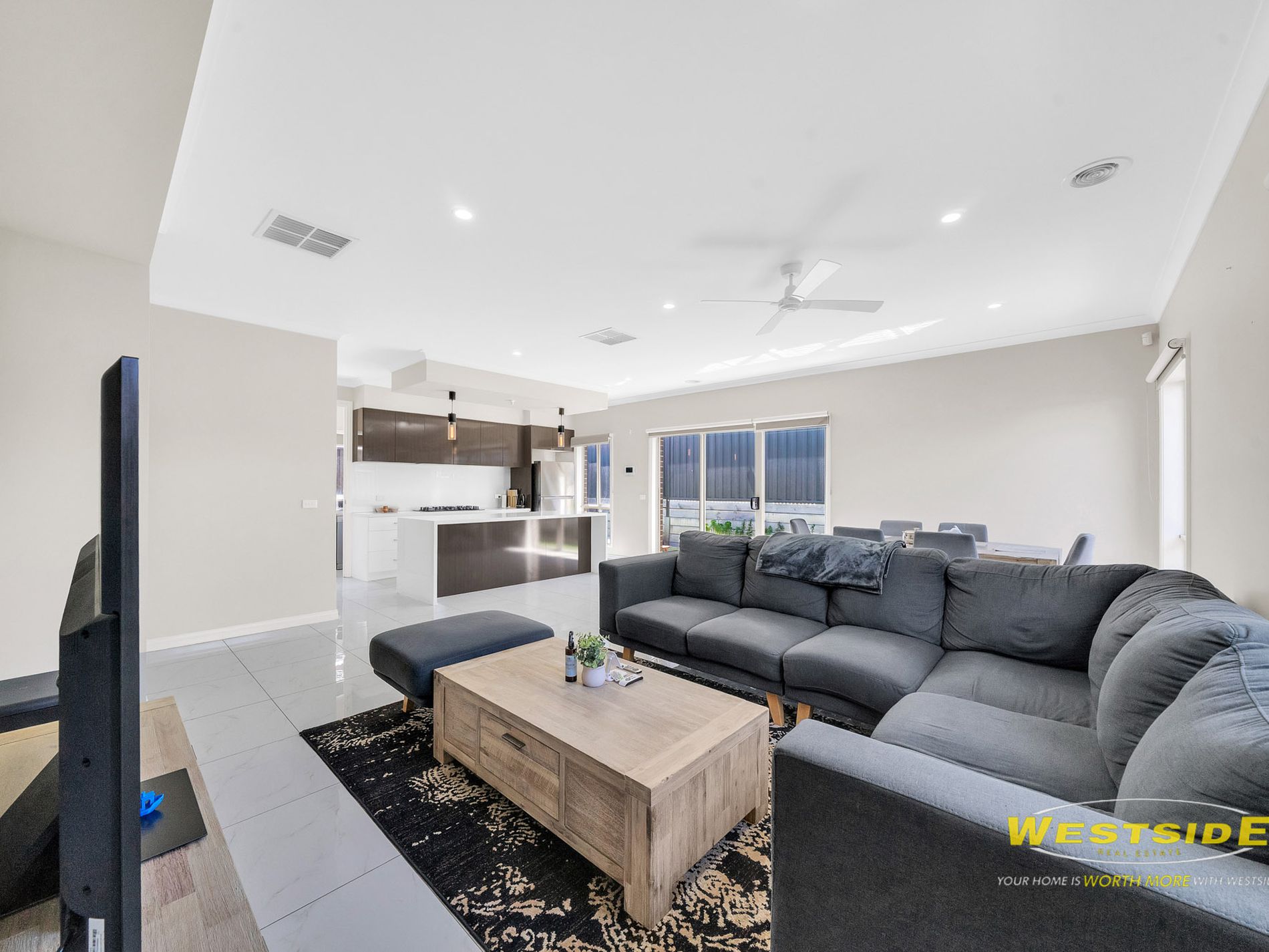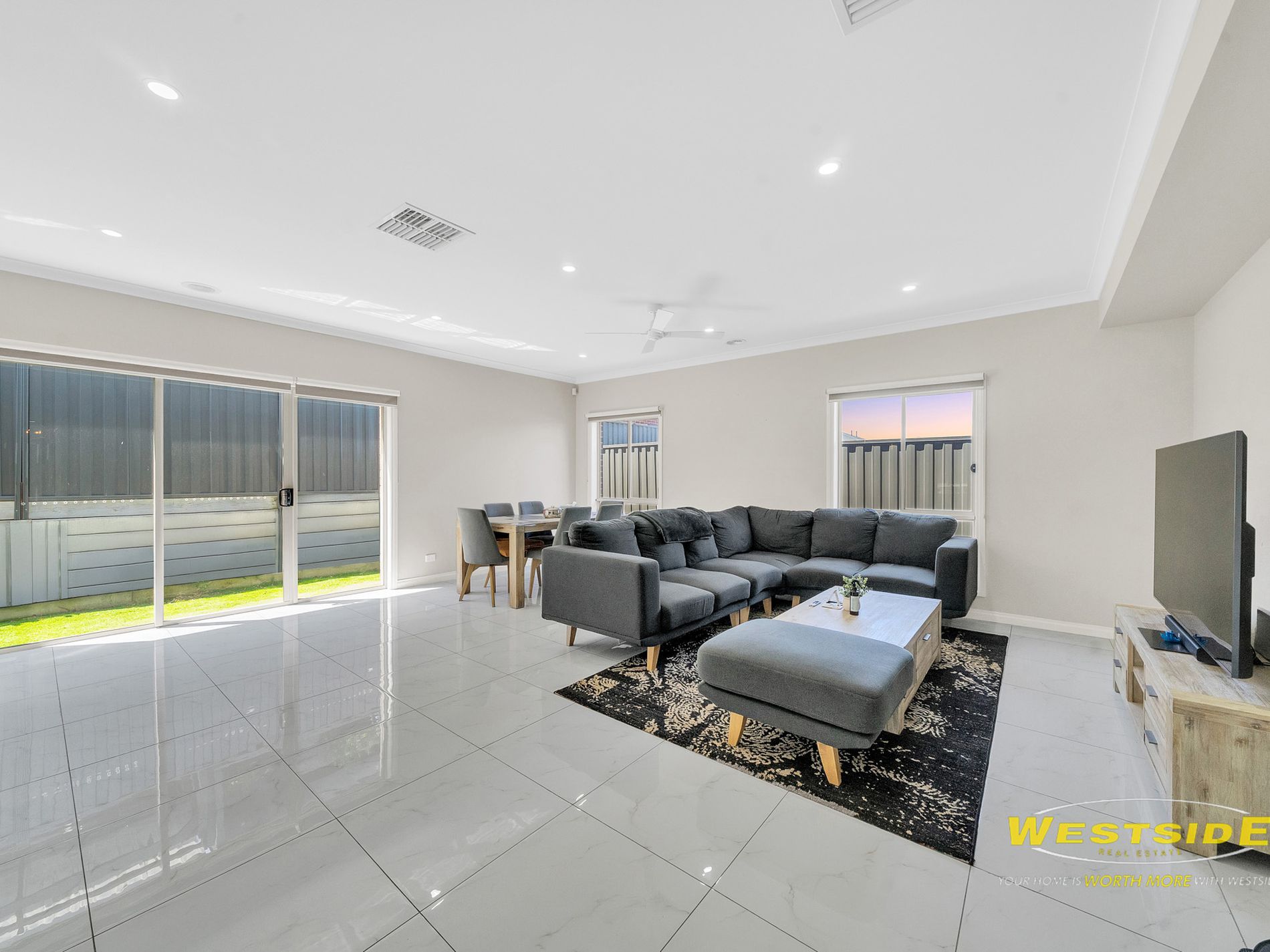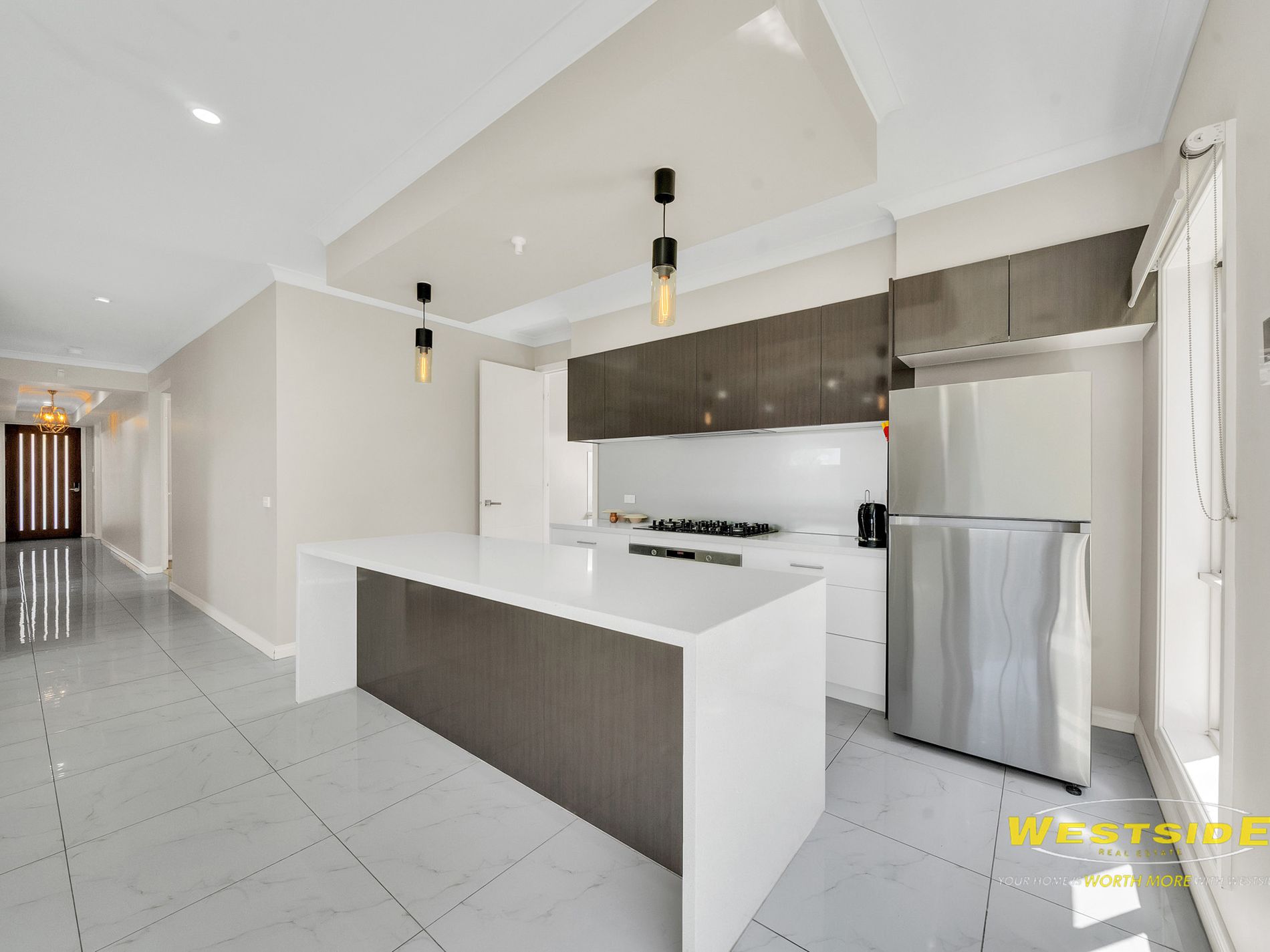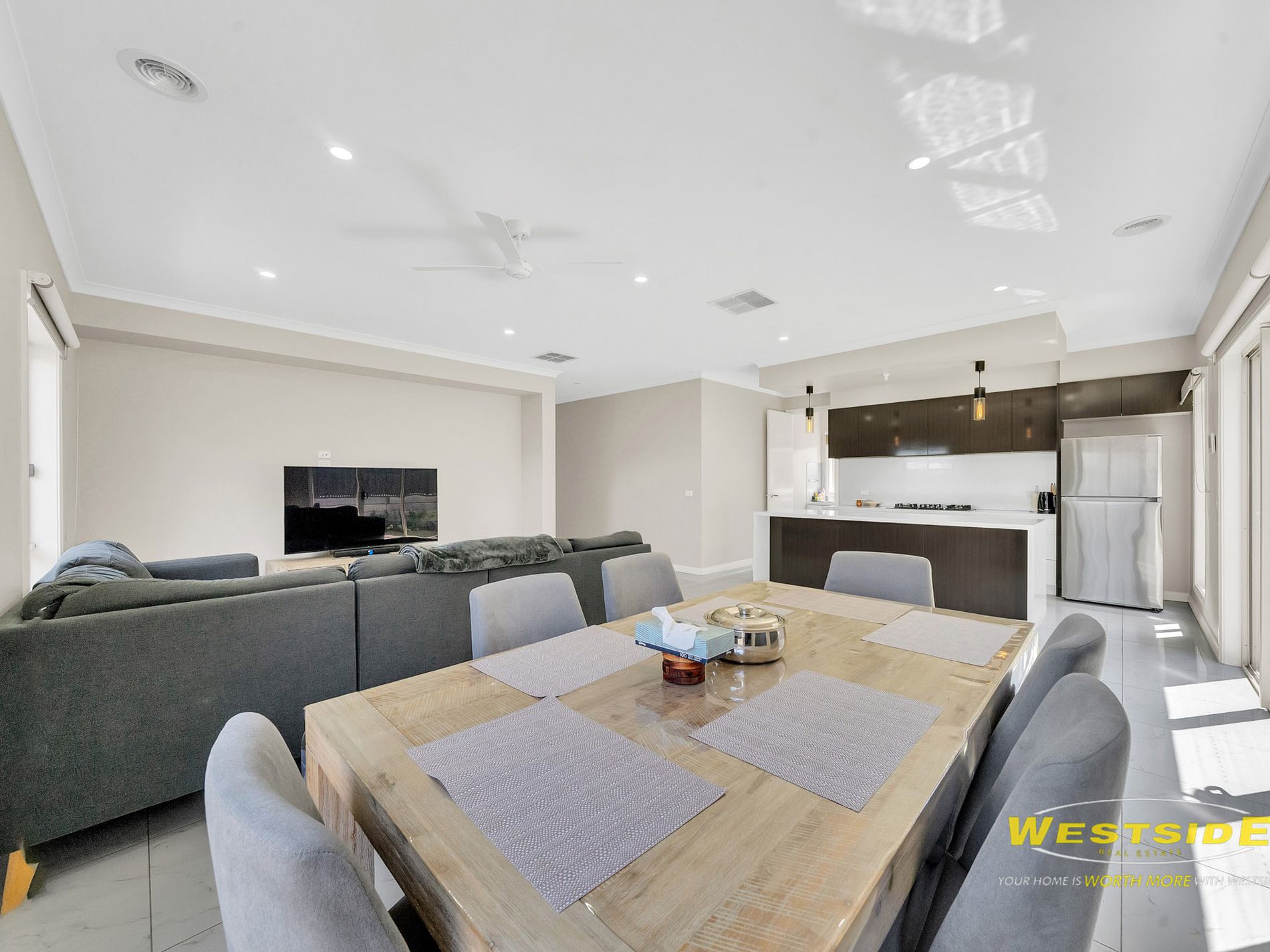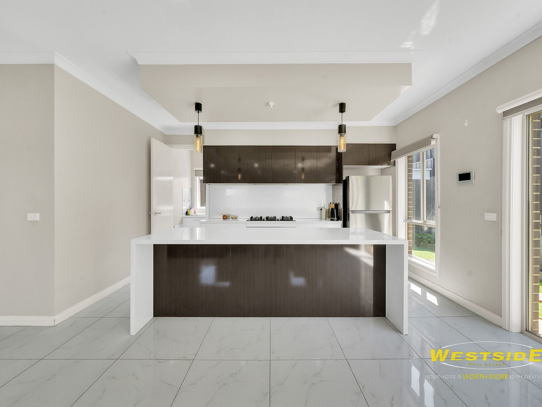 The heart of the home is an open-plan living and dining area, complete with glossy tiled floors, a designer kitchen with pendant lighting, stainless steel appliances, and a generous island bench—perfect for entertaining. Adjacent spaces include dedicated home office setups ideal for remote work or study.